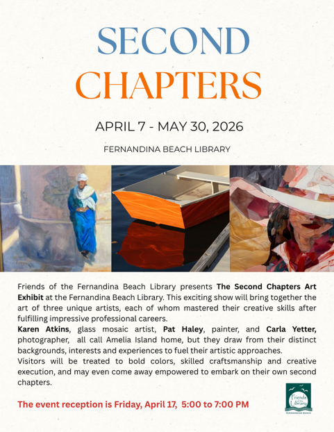 This exciting show will bring together the art of 3 unique artist, Karen Atkins, glass mosaic artist, Pat Haley, painter, Carla Yetter, photographer. All call Amelia Island home. Show runs 4/7 - 5//30. See link for more details